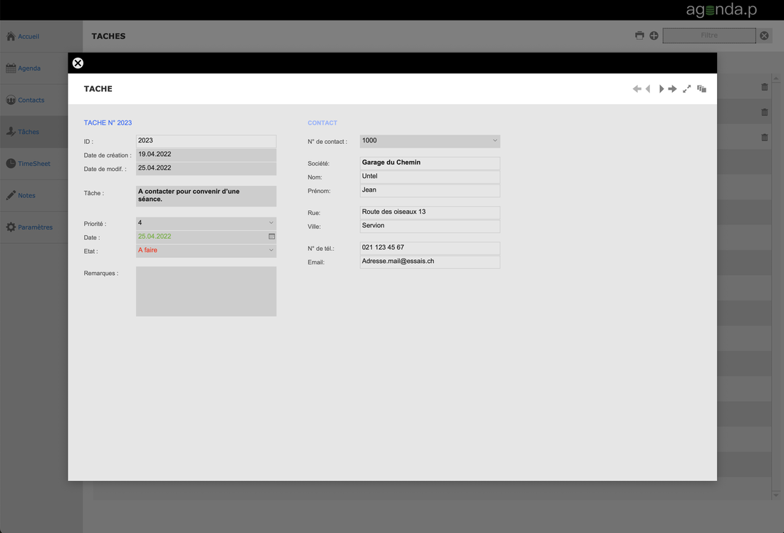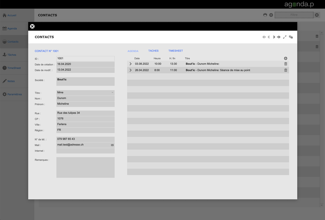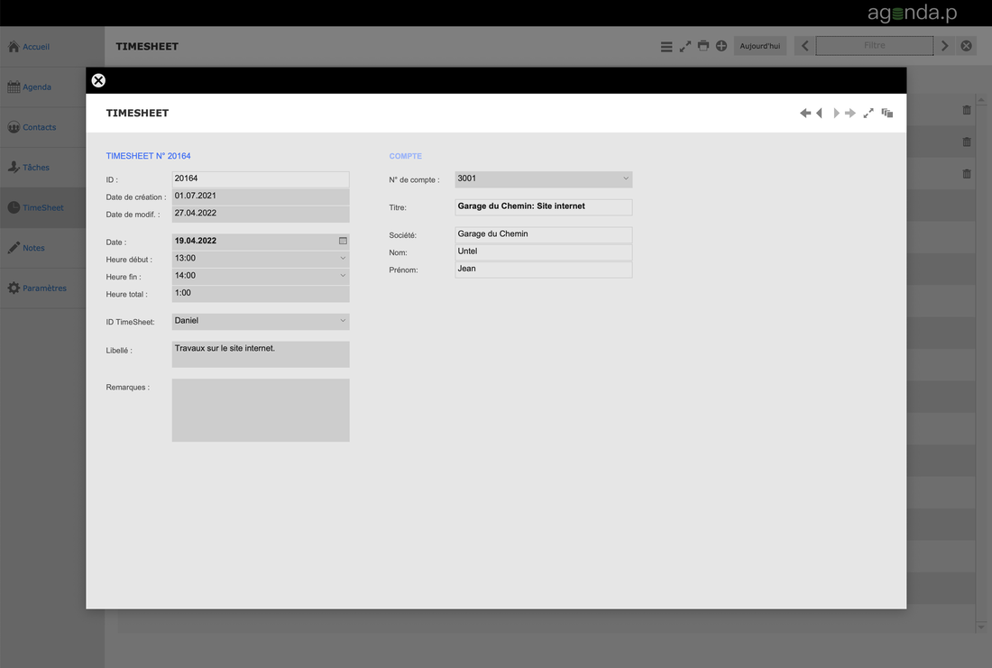 Cette solution vous permet de gérer votre agenda en fonction de vos contacts. Vous pouvez aussi ajouter des tâches ainsi que saisir vos temps de travail dans le TimeSheet.